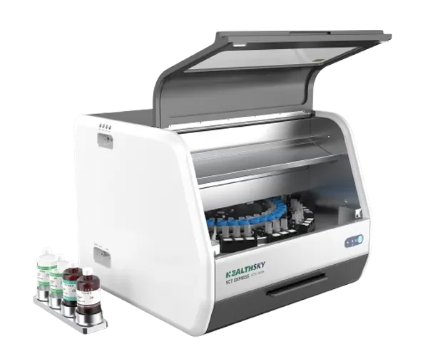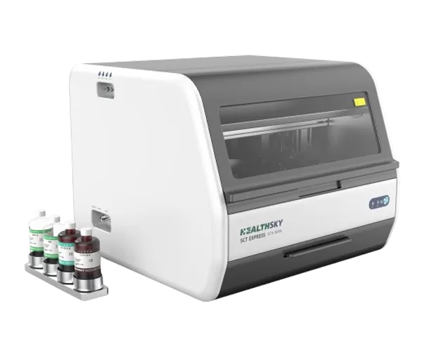 HealthSky est SCTE-3600A une station de travail de cytologie à base de liquide entièrement automatisée utilisée pour le traitement et la coloration des échantillons de cytologie. Le SCTE-3600A produit des lames monocouches avec un fond propre, un dépôt cellulaire optimal et une morphologie cellulaire mieux maintenue. Les diapositives produites peuvent être utilisées pour les catégories cytologiques telles que définies par le système Bethesda.